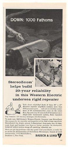 1963 Bausch & Lomb StereoZoom Microscope Bell Western Electric Undersea Repeater Print Ad description